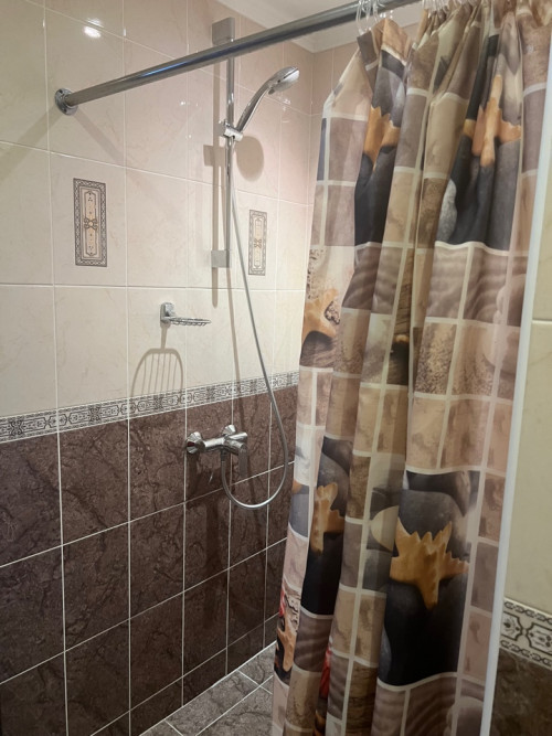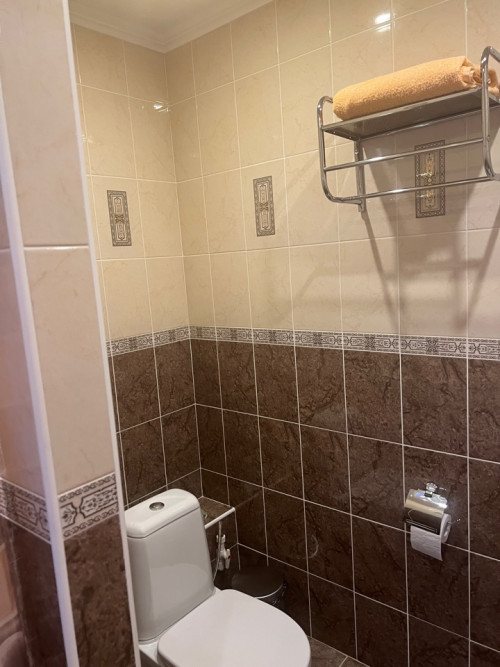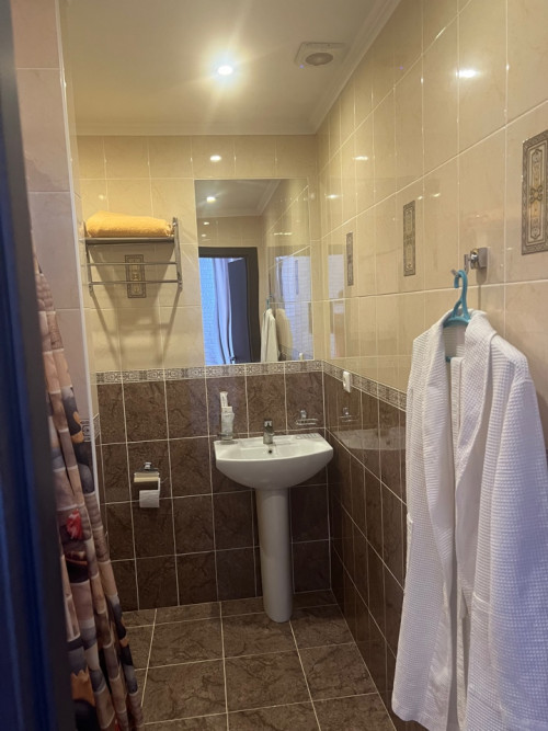 В ванной: туалет, раковина, душевая , средства личной гигиены, зеркало, набор полотенец, фен, халат, тапочки