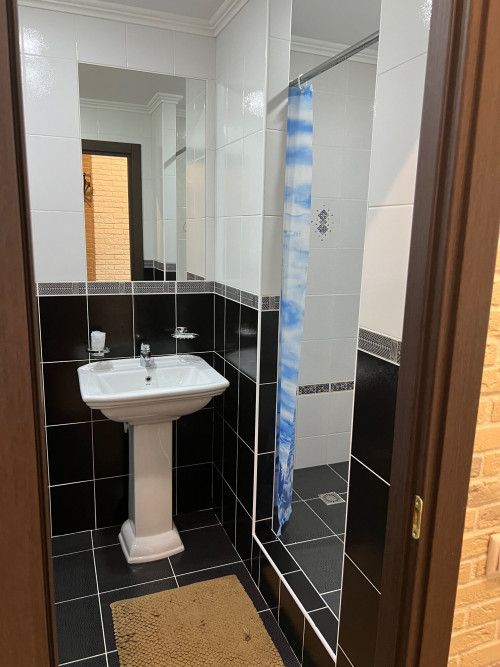 В ванной: туалет, раковина, душевая, средства личной гигиены, зеркало, наборы полотенец, фен.