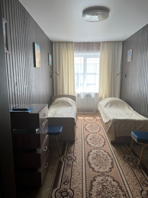 В номере: две односпальные кровати, стол, стулья, шкаф, прикроватные тумбочки, бра, гардероб, вешалка, щетка для одежды/обуви, Wi-Fi, телевизор, холодильник, фен.